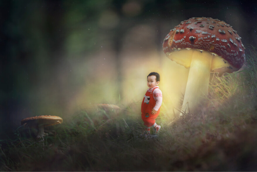 顔の表情と手の動きで目線をひきつけるも、決して主役のキノコにはかぶらないようにするというベテランのテクニックを惜しげもなく披露する天才子役
