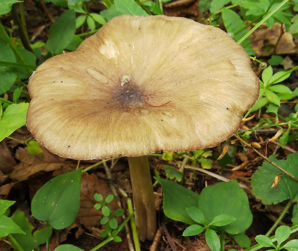 傘の表面は灰色、灰褐色または黒褐色で水っぽい質感をしており、放射状に広がる模様があります。発生当初、傘は山形をしていますが、徐々に平形に開いていきます。そして、最終的には傘の真ん中が窪むほど開き、すり鉢状となります。