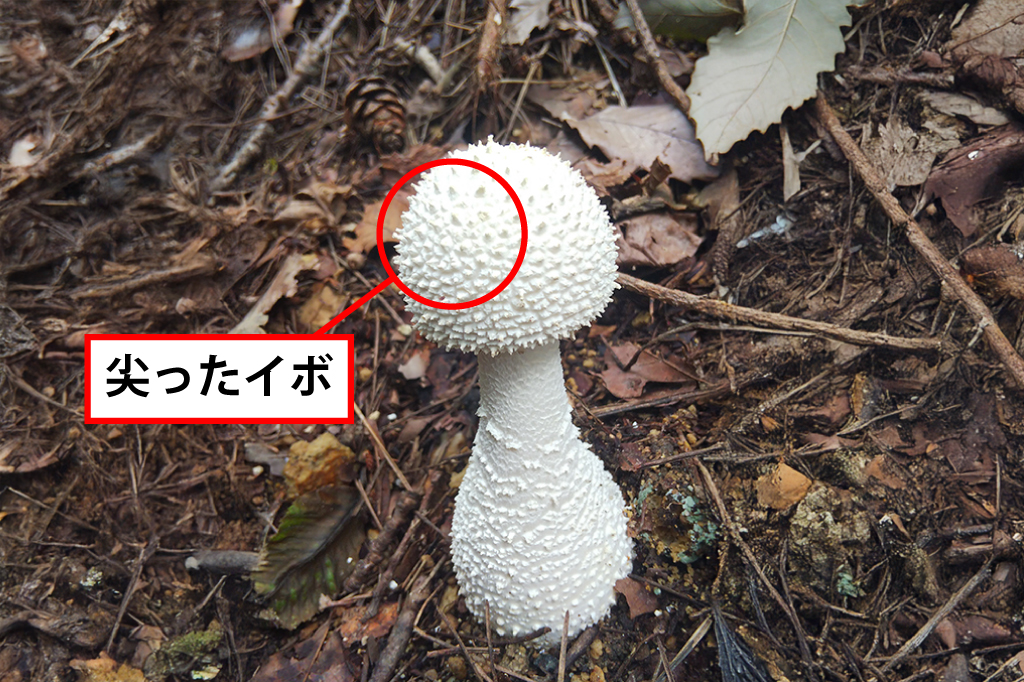 傘の表面は白色で粘性はなく、細かい粉に覆われています。また、発生したばかりの頃には、傘の表面に尖った「イボ」が多数見られるという特徴も。このイボはやや淡い灰色や淡い黄褐色を帯び高さ約1~3mm程度で、成長とともに取れていきます。