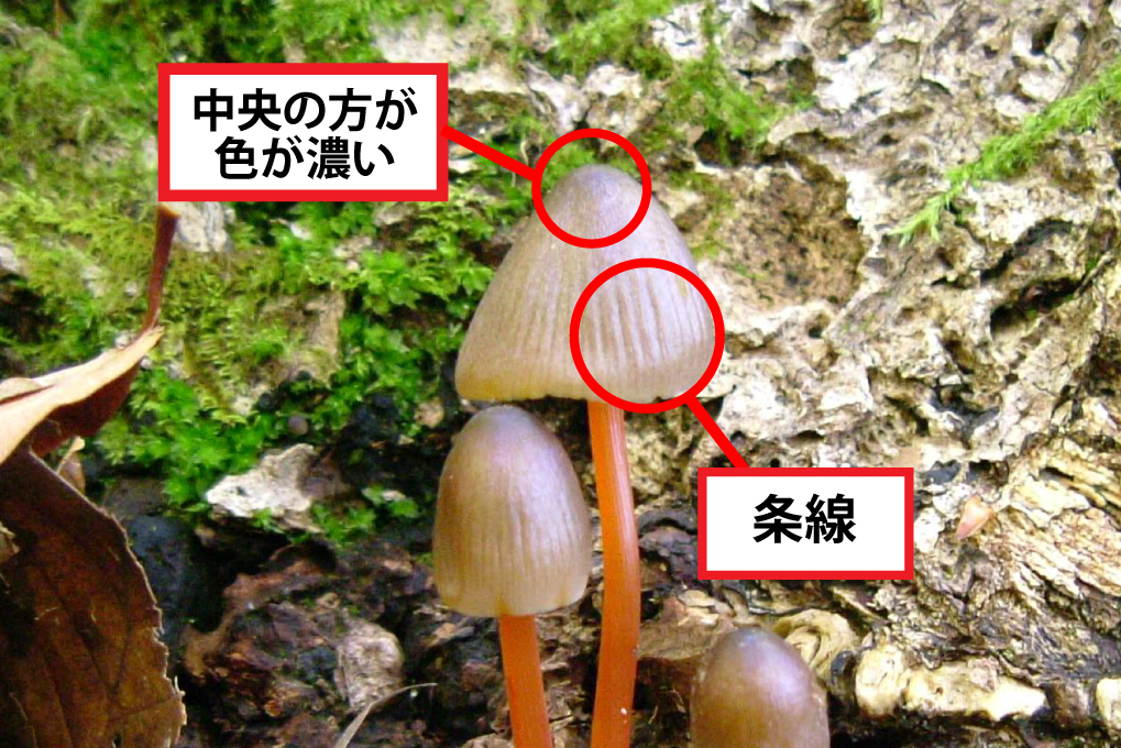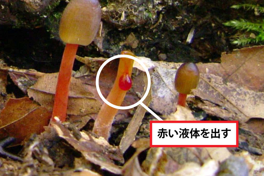 また、傘や柄を傷つけると、傷ついたところから橙紅色の液を出すことが大きな特徴です。