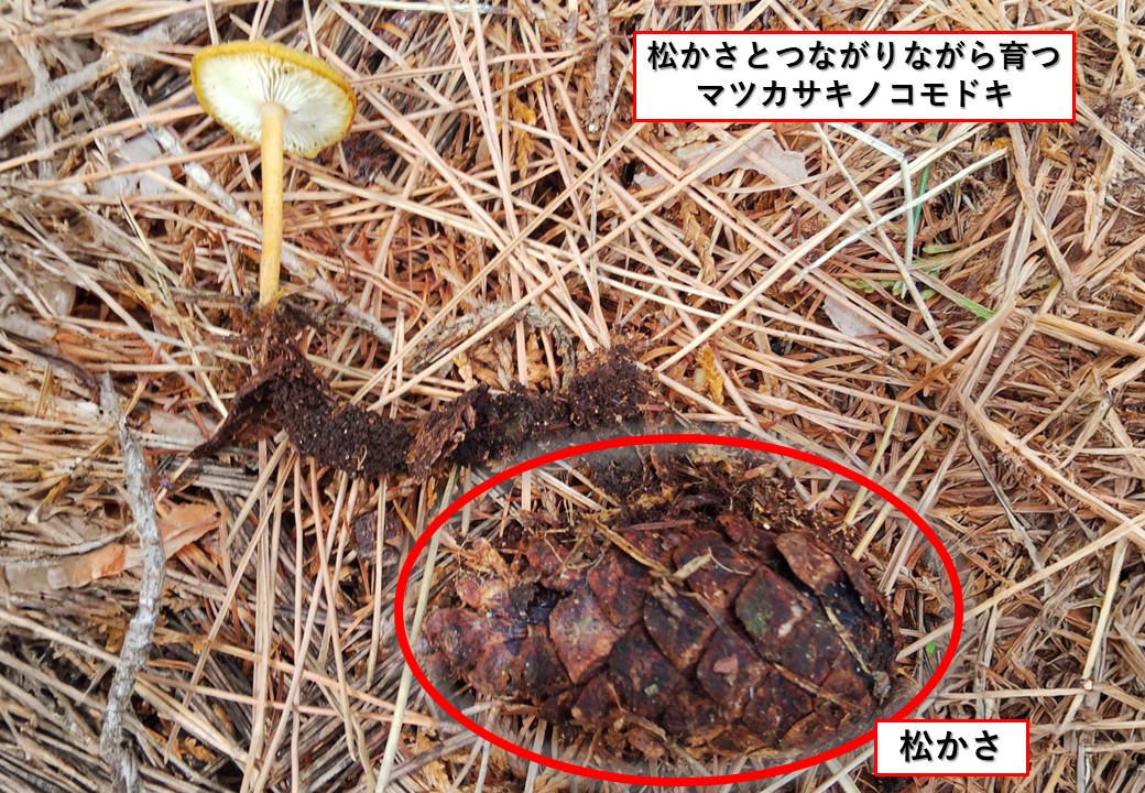 そしてマツカサキノコモドキの最大の特徴は、地中の“松かさ”から生えるということなんです。地上に顔を出す際には、柄の根元は約4〜8cmと長く伸びるそうです。
