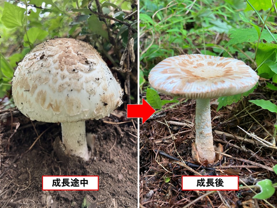 発生時は丸みのある鐘形をしており、成長と共に開いていき、最終的にはほぼ平らな形になります。