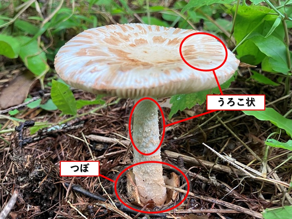 傘の表面はなめらかですが、白色から淡い褐色をしており、その上に淡い紅褐色の細かいうろこ状の鱗片(粉状鱗片)が付着しているのが特徴です。また、成長する際に、根元にあるつぼの一部が大きな破片として傘の縁に残っていることもあるそうです。