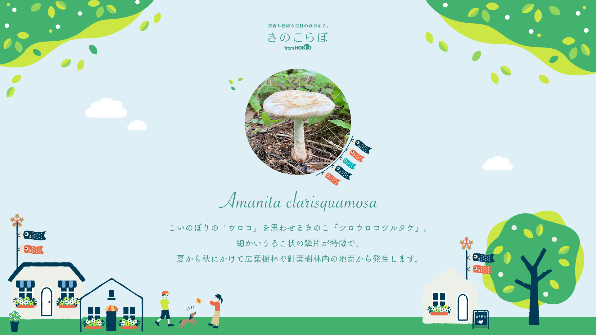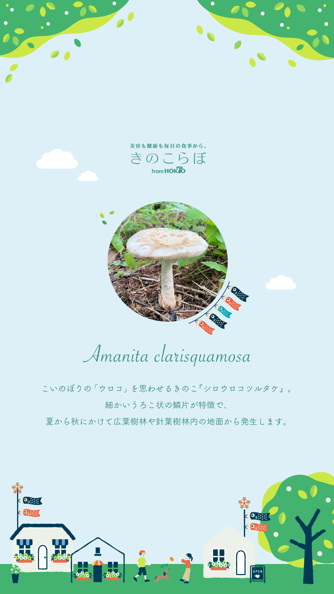 そこで今回は、こいのぼりの「ウロコ」を思わせる、傘の模様が特徴的なきのこ『シロウロコツルタケ』をご紹介します。