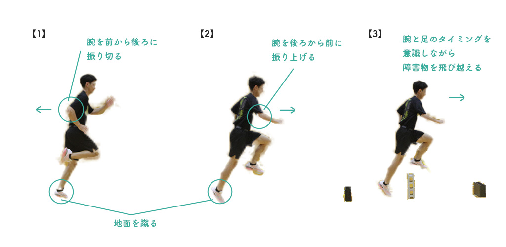 【3】1、2のタイミングがつかめたら、よりタイミングを感じやすいように、低い障害物などを用意してゆっくり走ってみましょう。