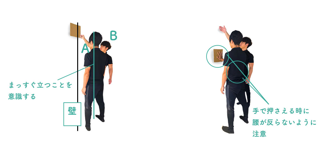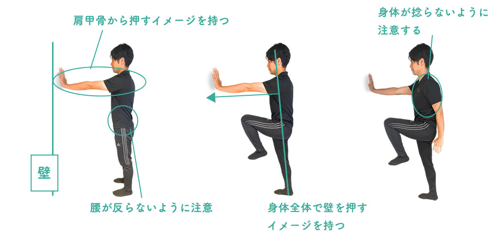 - ワンポイントアドバイス:背中が反ってしまう場合は手で壁を押すのではなく、身体全体で壁を押すイメージでやってみましょう!