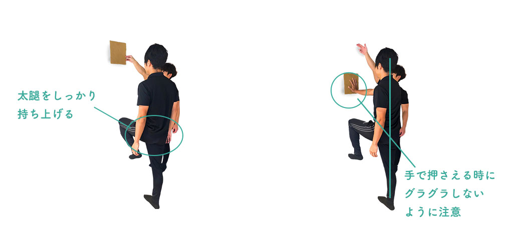 - 足を降ろします。右手を壁についたまま、左右を入れ替えて同様に実施します。