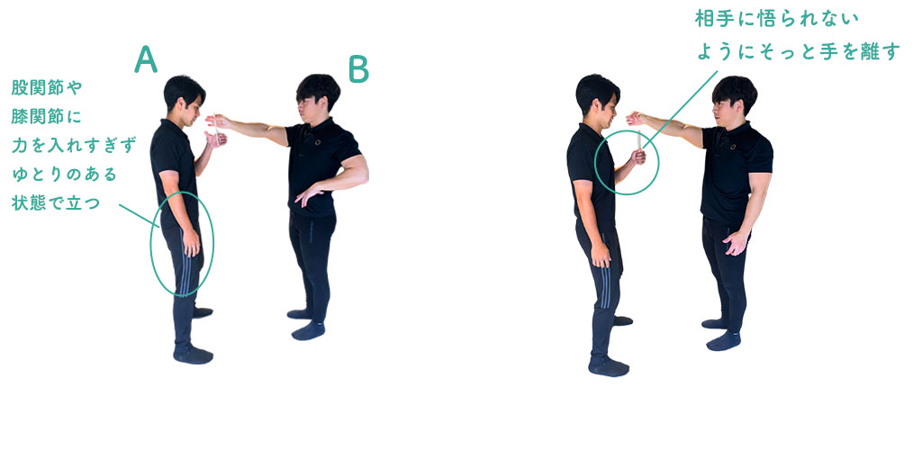 - Aは割り箸の下に手を入れすぐに掴める準備をします。