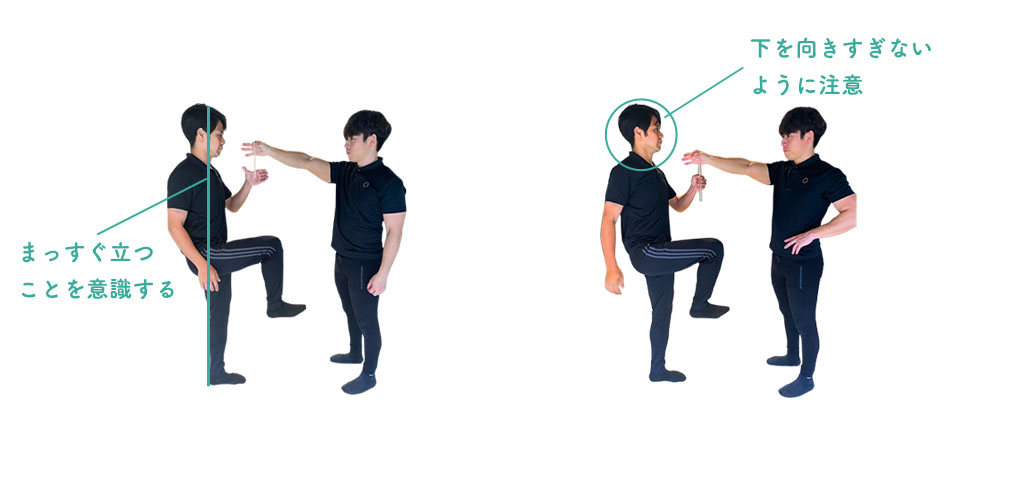 - 左手と右手を入れ替え、片足立ちを10秒間維持します。