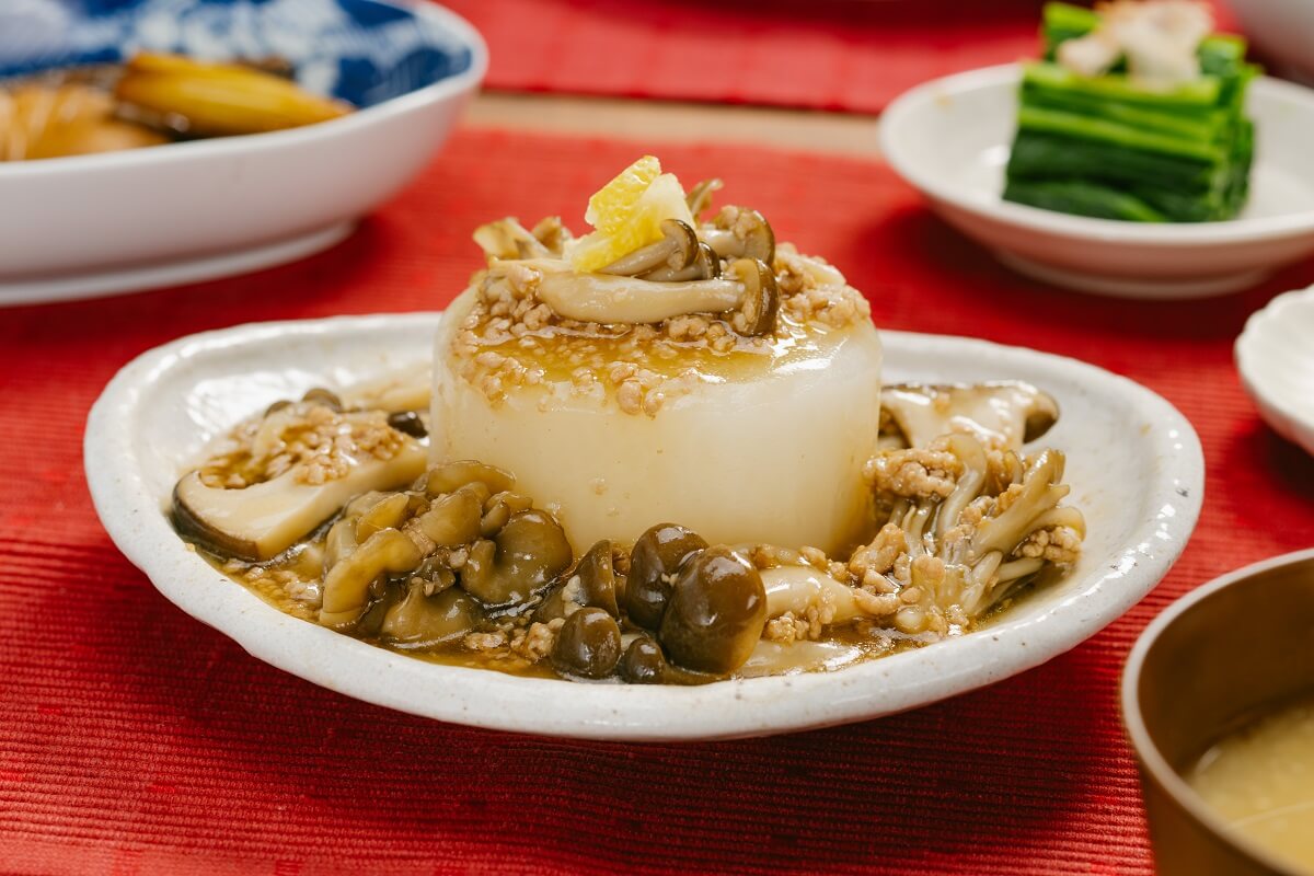 きのこに豊富なビタミンDは、免疫細胞の働きを正常に保つうえで欠かせない栄養素です。さらに、腸や皮膚のバリア機能を高める作用もあり、寒暖差で体調を崩しやすい時期の風邪予防に役立ちます。また、ビタミンDは日に当たることで体内で合成されますが、日照時間の短いこの時期は不足しやすいため、食事で摂ることが大切です。ほかにも、免疫力を保つためには、体温を一定に保つことも意識しましょう。あんには身体を温める効果が期待される生姜も入っており、とろみのあるあんは熱を逃がしにくいため、寒い時期にぴったりです。家族みんなの免疫力維持と寒さ対策におすすめの一品です。