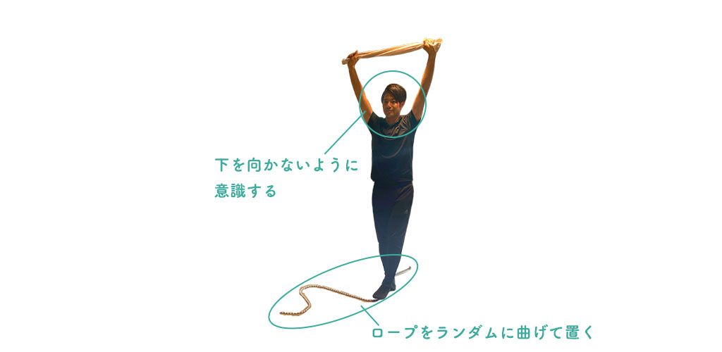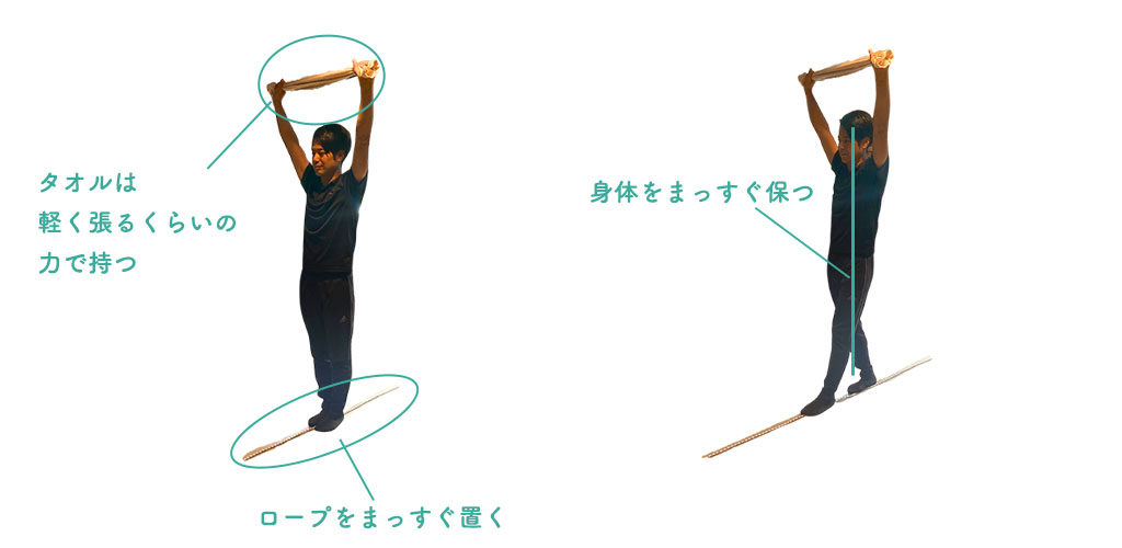 - ロープなど目印になるものを床にまっすぐに置き、その上に立ちます。