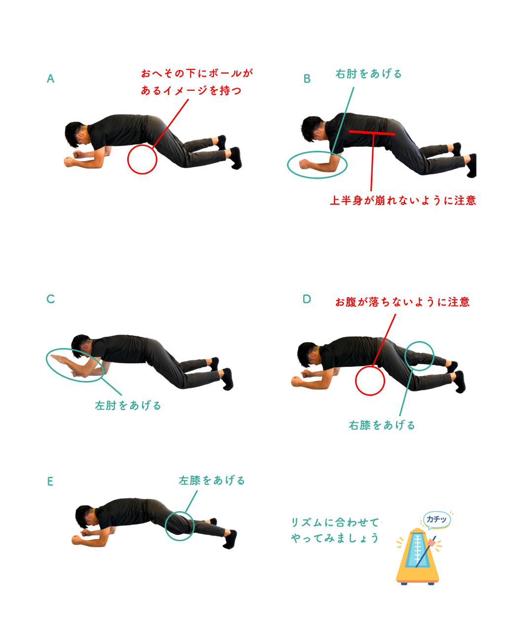 2. メトロノームのリズムに合わせて、右肘(B)→左肘(C)→右膝(D)→左膝(E)の順番に床から離します。※次の動作に移る際には、離した肘や膝は元の位置に戻します。
