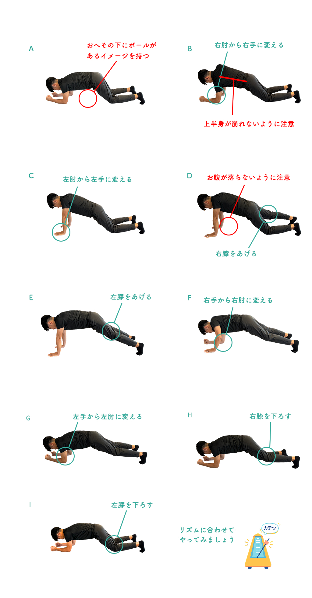 2. メトロノームのリズムに合わせて、右肘を離して右手をつく(B)→左肘を離して左手をつく(C)→右膝をあげる(D)→左膝からをあげる(E)→右手を離して右肘をつく(F)→左手を離して左肘をつく(G)→右膝を下ろす(H) →左膝を下ろす(I)の順番で姿勢を変えます。