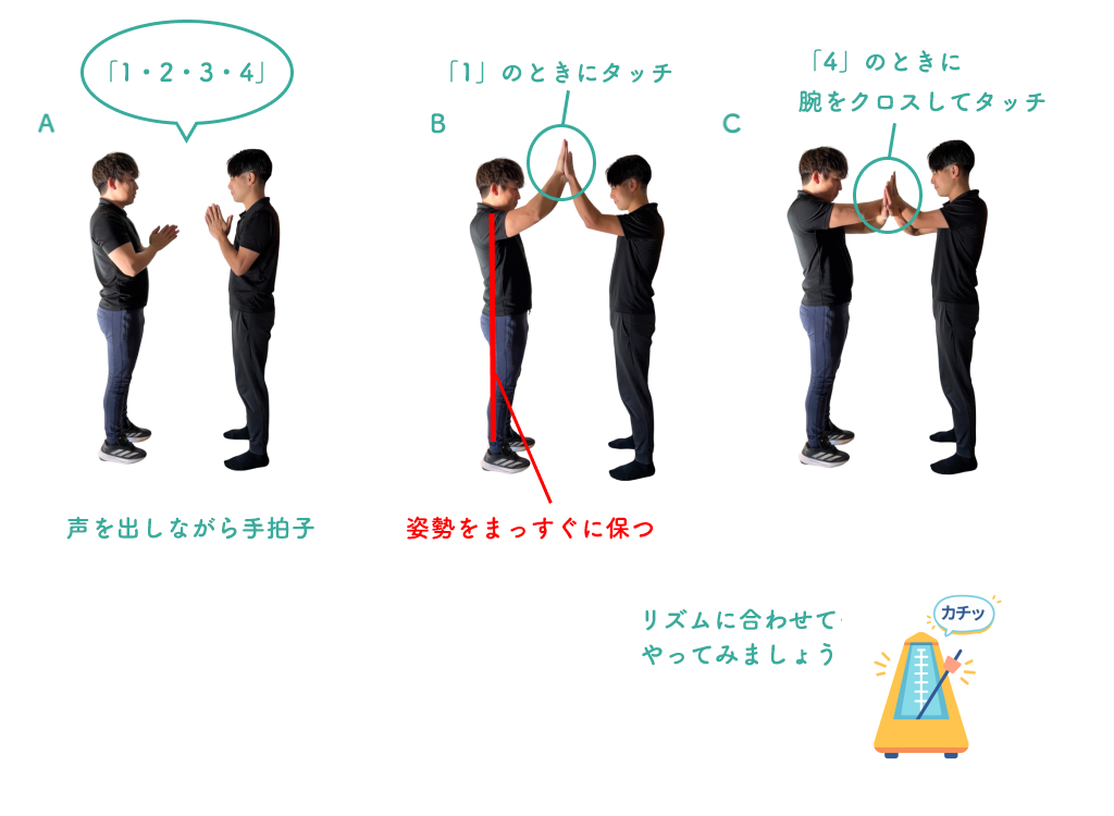 2. 次に、「1」のタイミングでお互いの手のひらを合わせます(B)。「2・3・4」は手拍子にもどります。これを3回繰り返します。