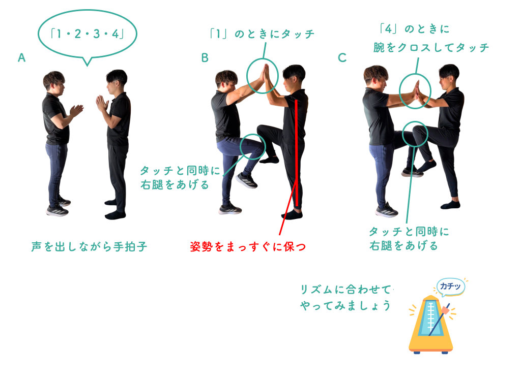 3. 次に「1」のタイミングでお互いに手のひらを合わせるときに、右足をあげます(B)。「2・3」は足を下げ手拍子を打ち、「4」のタイミングでお互いに手をクロスして手のひらを合わせ、左足をあげます(C)。