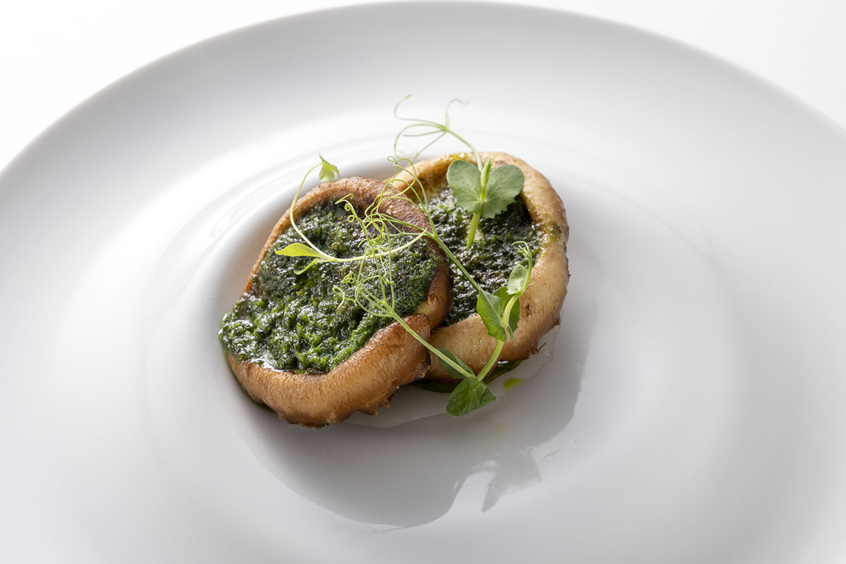 お出汁を吸った生どんこのエスカルゴバター焼き