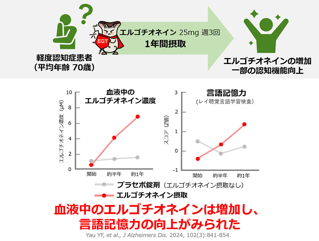 では、実際にエルゴチオネインを摂取するとどうなるのでしょうか。軽度認知障害の患者19人を対象にした研究をご紹介します(2)。エルゴチオネインサプリメント25mgを週3回(1日あたり約10mg)1年間継続して摂取した結果、血中のエルゴチオネイン濃度は着実に上昇を続け、言語記憶力など一部の認知機能の向上が見られました。さらに、副作用も報告されていません。つまり、エルゴチオネインは体内に蓄積されやすく、継続的に摂取することで脳の健康維持や認知症予防につながる可能性が示されています。
