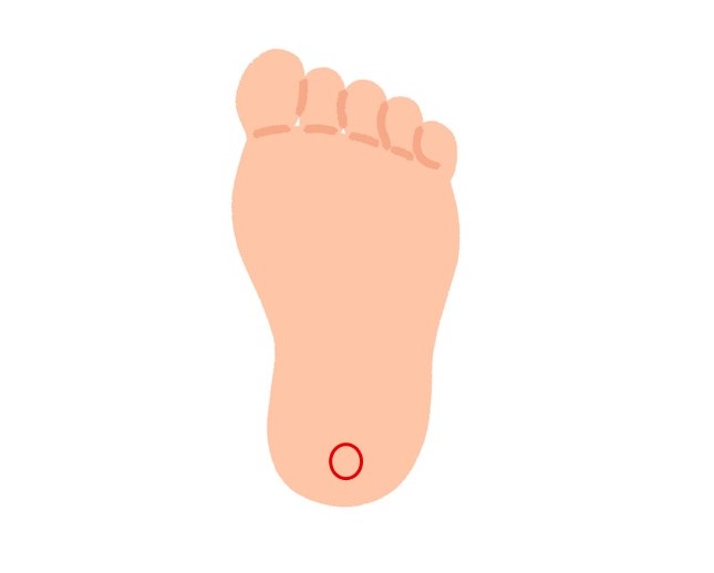 足の裏側、かかとの中央部分にある少しへこんだ部分にあります。