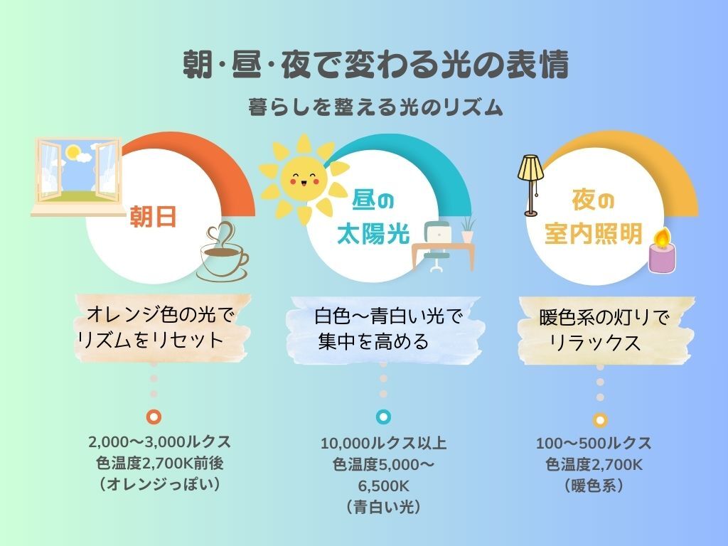 1日の中で光の使い方を工夫することは、生活リズムを整えるうえで大切なポイントです。