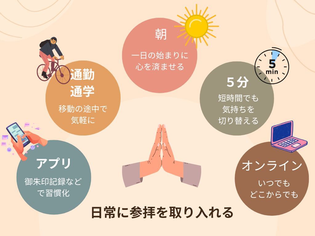 このように、朝の時間や通勤途中の立ち寄り・短時間参拝、アプリの活用、オンライン参拝などと、ライフスタイルに合わせたさまざまな形を取り入れることで、参拝は「続けやすい小さな習慣」となり、日々の暮らしに穏やかなリズムを生み出してくれるでしょう。