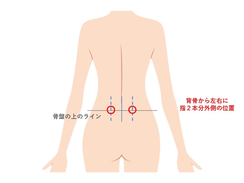 腰の骨(骨盤の上のライン)の高さで、背骨から指2本分外側の左右にあります。
