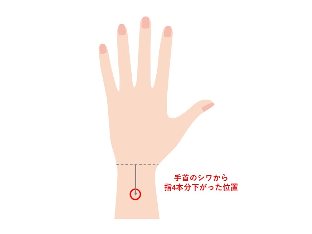 手首の甲側のシワから、指4本分ひじ側へ進んだ、2本の骨の間にあります。
