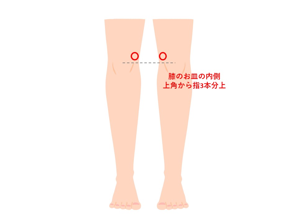 膝のお皿の内側の上角から、指3本分ほど上がったところにあります。