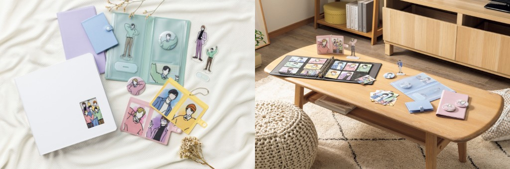 推し活の記録や大切な推しのコレクション整理にぴったりのシリーズでバインダーとカード用ケース、グッズ用ケースが販売されています。バインダーはインテリアにも溶け込むシンプルなデザインで、カード用ケースはカードを収納して鞄などに付けられるタイプ、グッズ用ケースは缶バッジやアクリルスタンド等のグッズを収納できるタイプで、ひそかな推し活を楽しめるアイテムがそろっています。