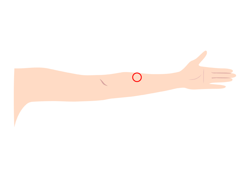 腕の内側で親指側にあります。肘の横ジワと手首を結んだ線上で、肘から約1/3のあたりが目安です。