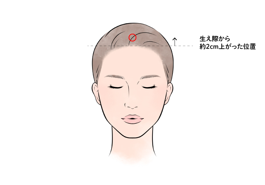 額の左右中央のライン上で、髪の生え際から上に親指の幅1本分(約2センチ)上がったところにあります。