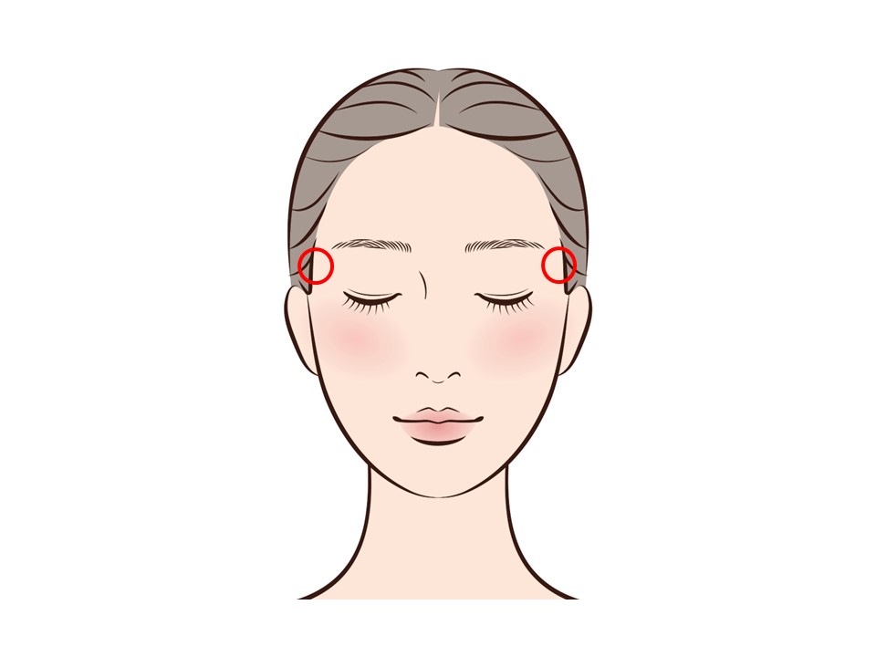 眉尻(眉毛の外側)と目尻の中間から、指2本分ほど外側に向かったところにある「こめかみ」のくぼみです。