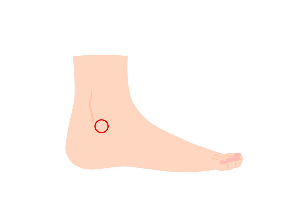足の外くるぶしの前方、やや下にあるくぼみです。足首を外側に曲げたときに、一番深くへこむところが目安になります。