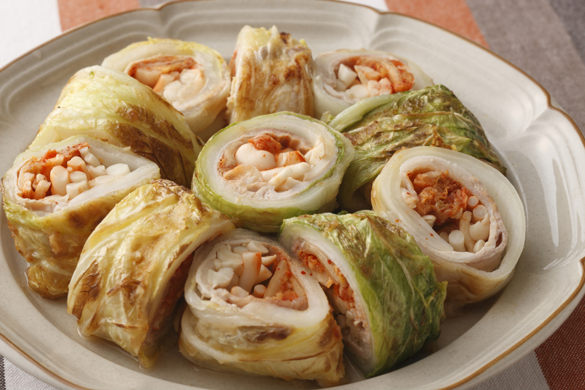 白菜の上に塩こしょうをした豚肉、キムチ、ブナピーをのせて巻く。