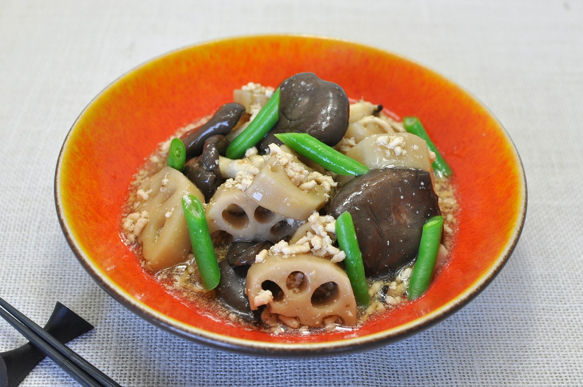 霜降りひらたけを加えて更に5分ほど煮る。【B】を加えてとろみをつけ、いんげんを加えて2分ほど煮て火を止める。
