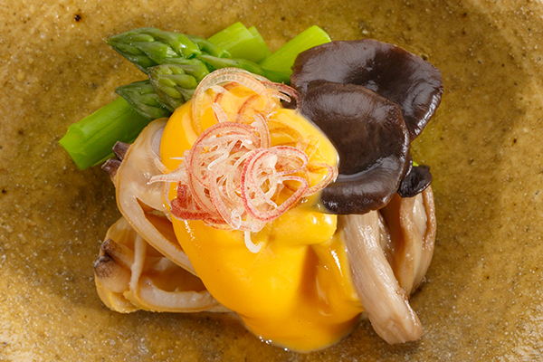 旬のあさりを、霜降りひらたけと一緒に。 霜降りひらたけの香りや旨味に、あさりの風味、コクのある黄身酢がよくあいます。黄身酢は「酢」という名前がついているものの、そこまで酸味は強くないので、風味豊かに素材の味を引き立てます。日本酒と一緒にお楽しみいただきたい、旬の一品です。だし活用にも◎