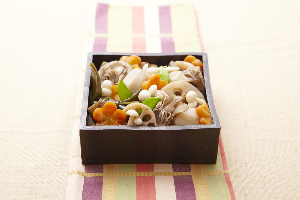 れんこんは皮をむいて輪切りにし、酢水にさらす。ごぼうはよく洗い長さ3cmに切りそろえ、にんじんは8mm幅の輪切りにして梅型でぬく。里芋は皮をむき、耐熱容器に並べて電子レンジ(600W)で3分ほど加熱する。