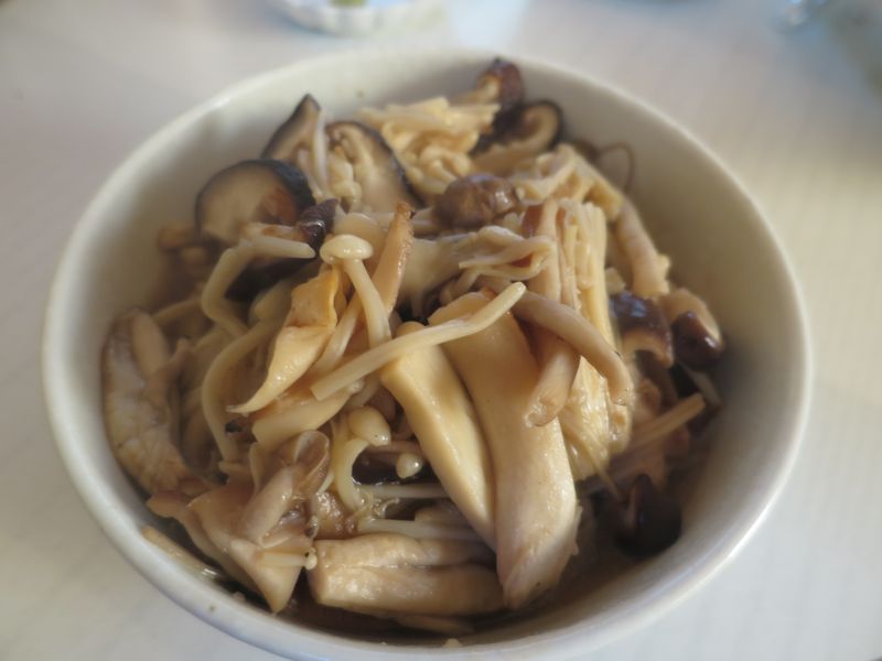 アルミホイルにきのこを入れ、調味料とお酒、少量のだし汁を加えレンジでチンするだけの簡単一品です