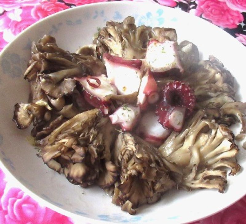 マイタケを焼くときの香りって、大好きです。オーブントースターで焼いて、タコと一緒にオリーブオイルで和えてみました。