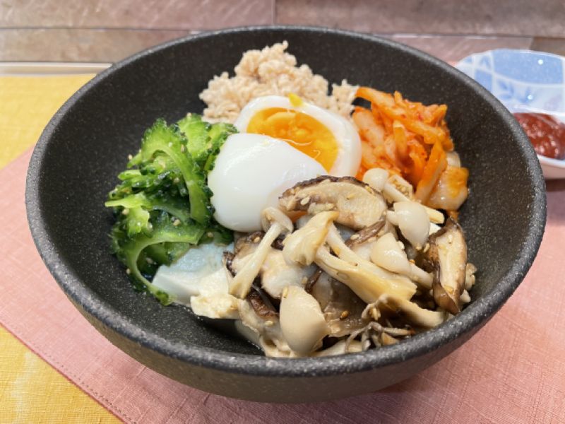 油を使わずローストしたきのこと、ほろにがシャキシャキのゴーヤ、鶏ひき肉、キムチ、半熟卵を豆腐の上にビビンバ風に盛りつけました。丼にすることで食べやすく、ボリュームたっぷりで栄養満点の一品です♪