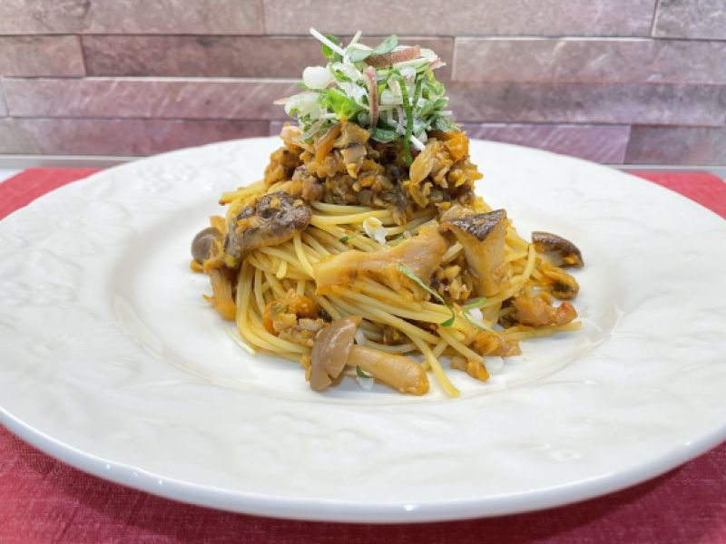 茹でたスパゲティと5を混ぜ合わせ、お皿に盛り付けて飾り用キノコを散らす。合わせ薬味をのせて完成。