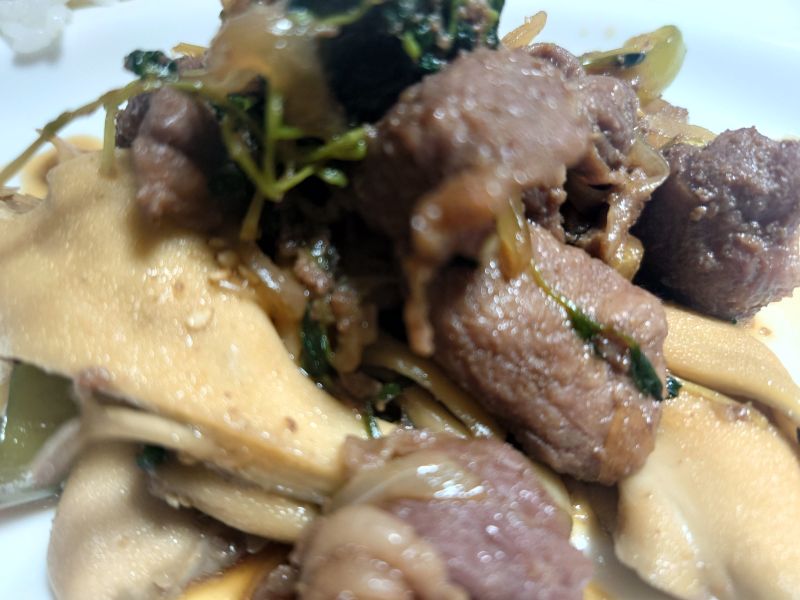 野菜を先に炒め、肉に火を通し、最後ににくに火をいれる。焼き肉のたれやポン酢をまわしいれできあがり