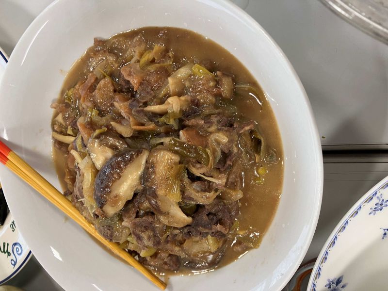 ネギ類と椎茸がしんなりしたら、調味液を回し入れさらに蒸し煮する。 肉をいったん取り出して一口大にカットする。(最初から一口大にカットしておいてもOK)