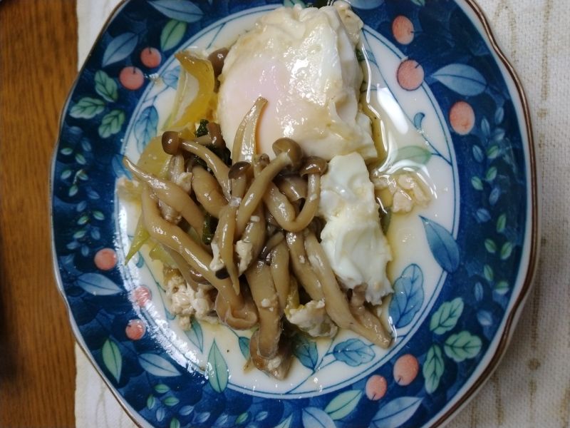 フライパンお酒少量と本だしを加えて、たまごをおとして蒸し焼にし、取り置きしていた青梗菜としめじを戻し温めたら、出来上がり。