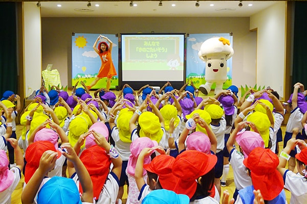 思い出動画 今日キャラバン隊がおじゃまするのは、 大分県大分市内にあるひまわり幼稚園です。 丸いまどがいっぱいあって、かわいらしい幼稚園だね。 「もぎとるのがもったいない~」って言うくらい きのこのことがお気に入りだったね♪ はじめてのもぎ取り体験、楽しい思い出になったね! きのこ先生のおはなしを聞いて、 きのこにはいいことが沢山ってことがよく分かったね。 「よーし、がんばってきのこを食べるよ」って、 みんなできのこをおいしくいただきましたぁ♪